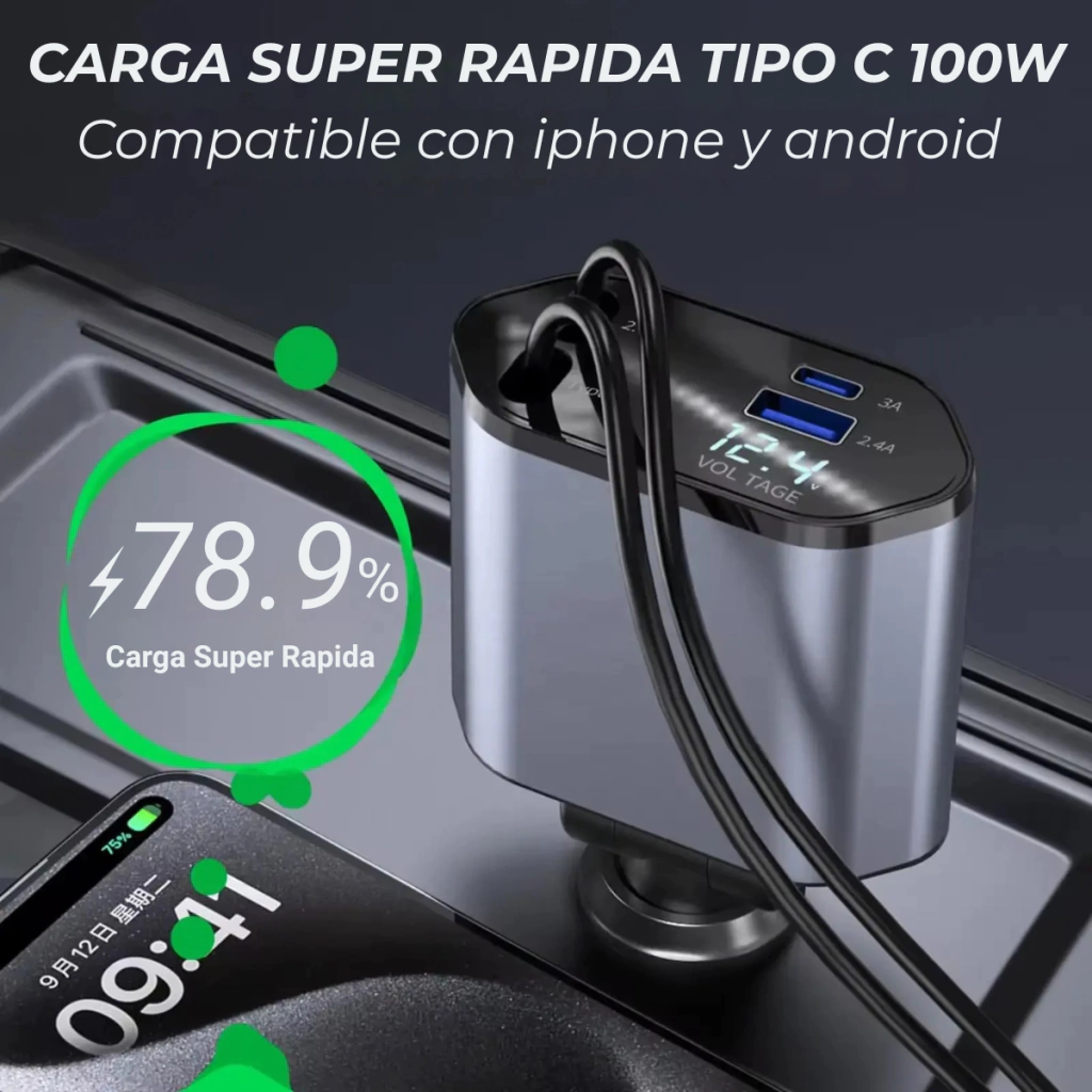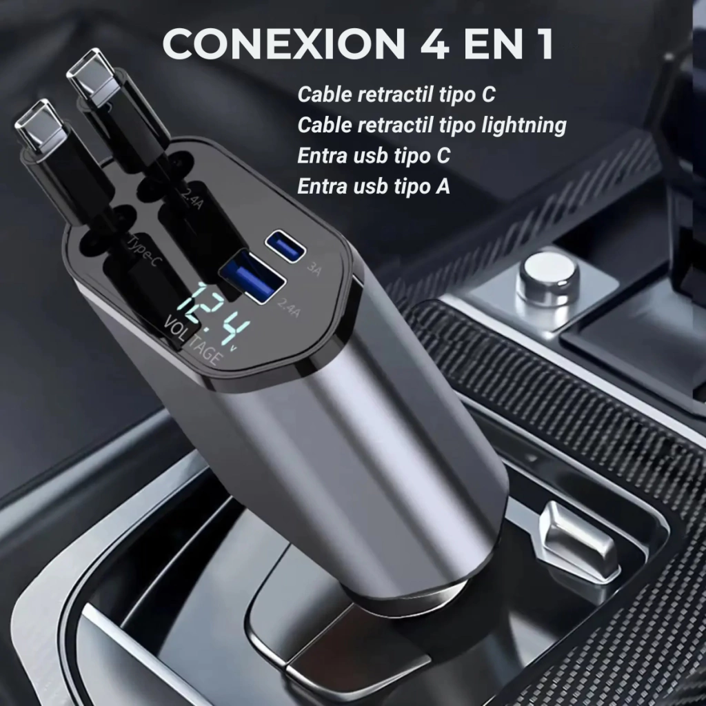 El cargador definitivo para tu auto: rápido, práctico y con cables retráctiles que mantienen tu vehículo impecable.